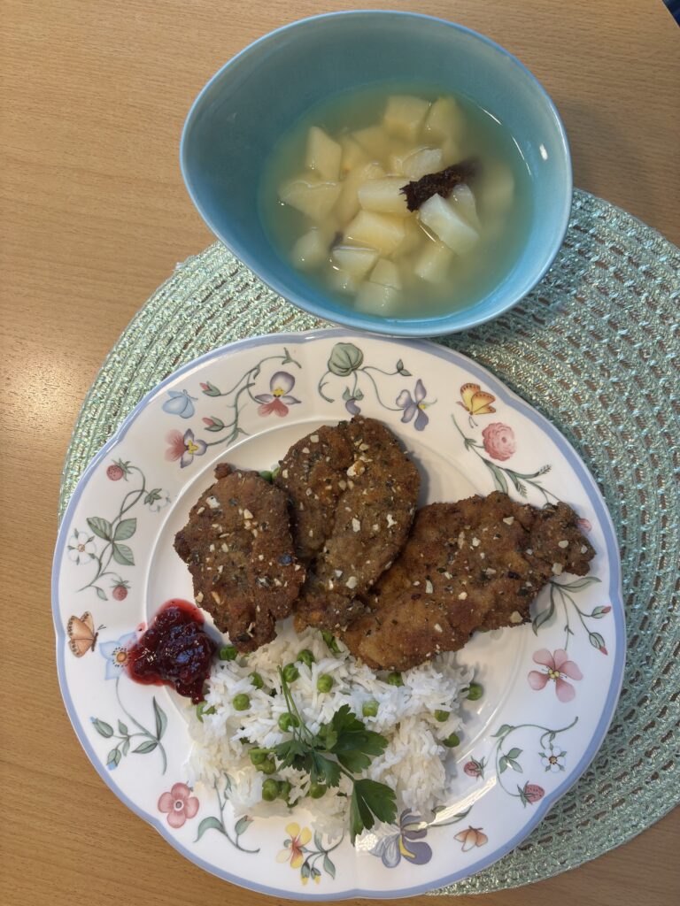 Als Beilage empfehlenswert ist Langkornreis mit Wildreis, Erbsenreis und Birnenkompott. Zitronenscheibe mit Preiselbeeren zur Dekoration.